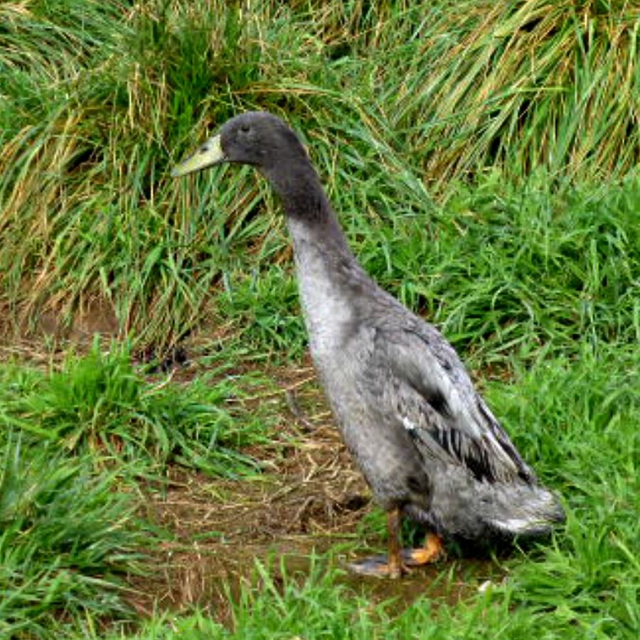 Blue Runner Ducks are tall, slender waterfowl with an vertical stance. The Blue Runner Ducks, like other varieties of Indian Runner Ducks, have a slightly nervous temperament and tend to run clustered together as a group. Runner Ducks varieties include the Fawn and White, Chocolate, Blue and Black. The Chocolate and Black varieties will breed true, however the Blue will not as only 50% of the offspring of ducks and other waterfowl and poultry that carry a blue gene will be blue.
